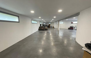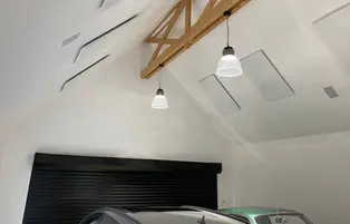 Here is a two-car garage of approximately 60m². The "Enzo-Style" light fixture, entirely designed and manufactured by our team, makes its first appearance. Aesthetically pleasing and refined, it creates an impression of depth in this garage. The effect is guaranteed!