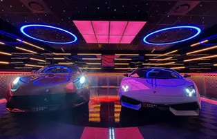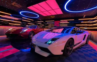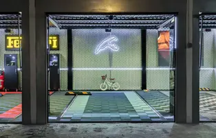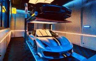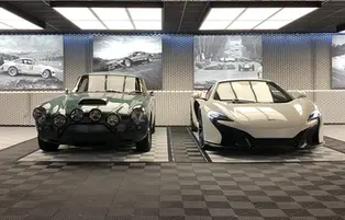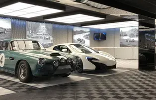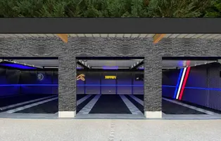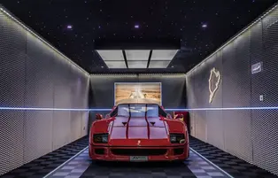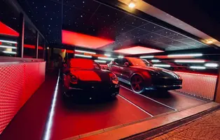 Here's one of the most beautiful Innova-box garages, a 150m² space filled with supercars. It features all sorts of lighting fixtures, options, and materials… This garage is sure to turn heads!